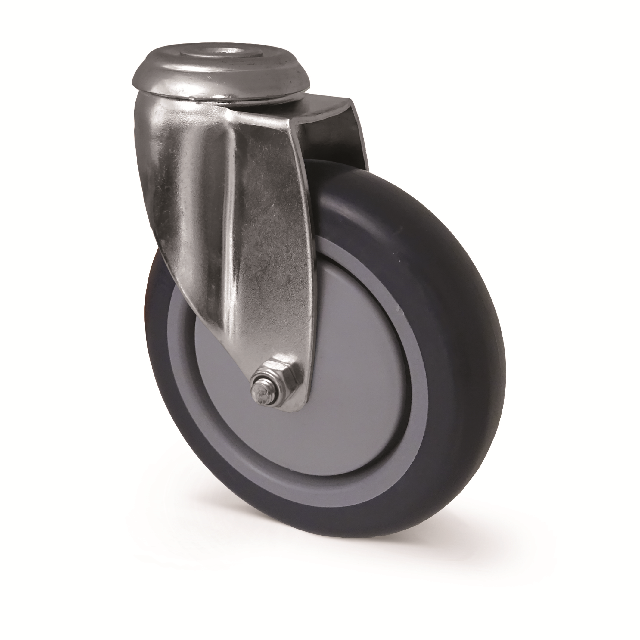 Länkhjul, gaffel tillverkad av pressat stål, zinkkromaterad, svängkrans med dubbelt kullager, hjulaxel med mutter, bult hål.