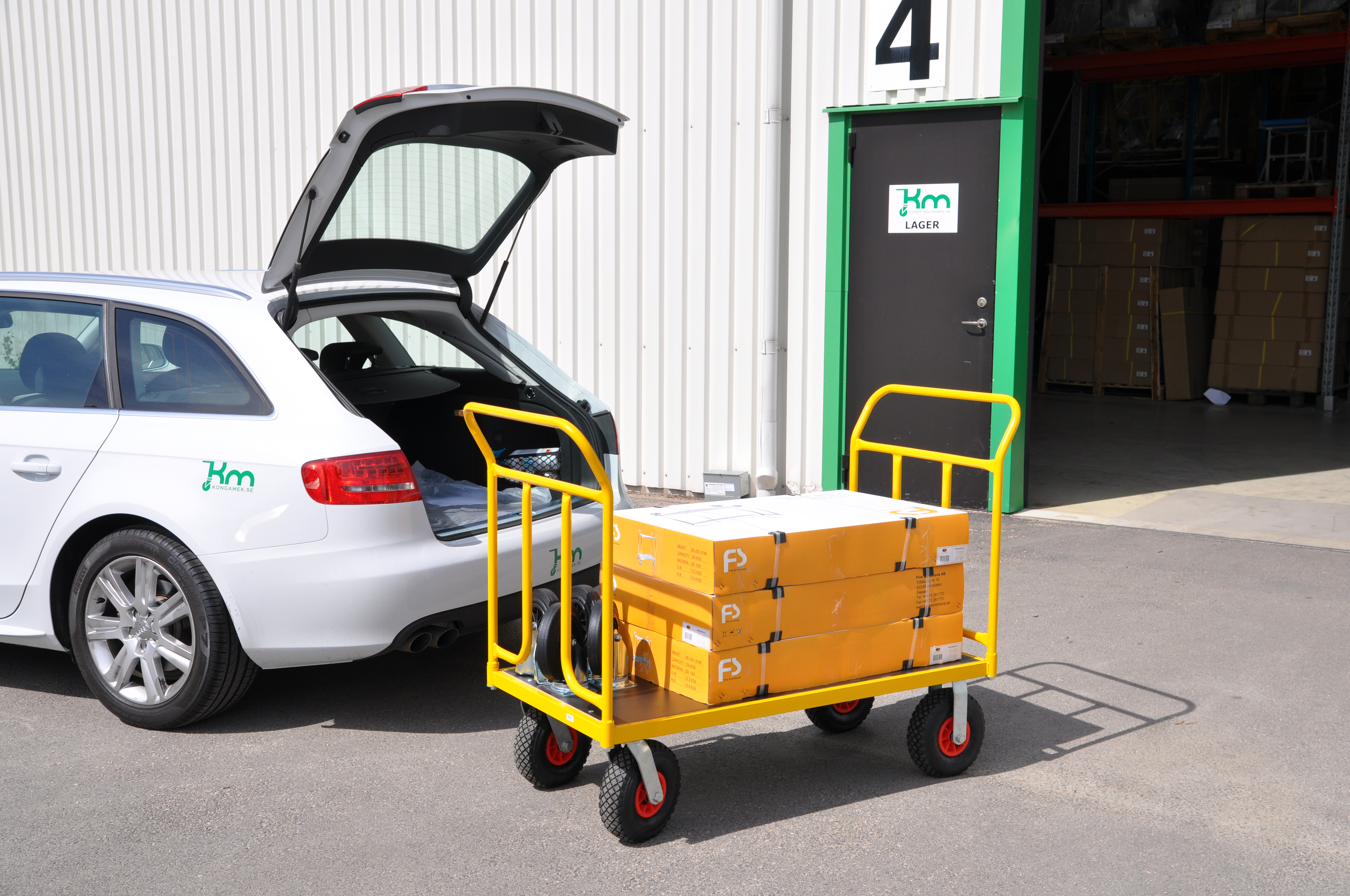 Gullackerad plattformsvagn i robust konstruktion med laminatskiva. Finns i 9 olika modeller.