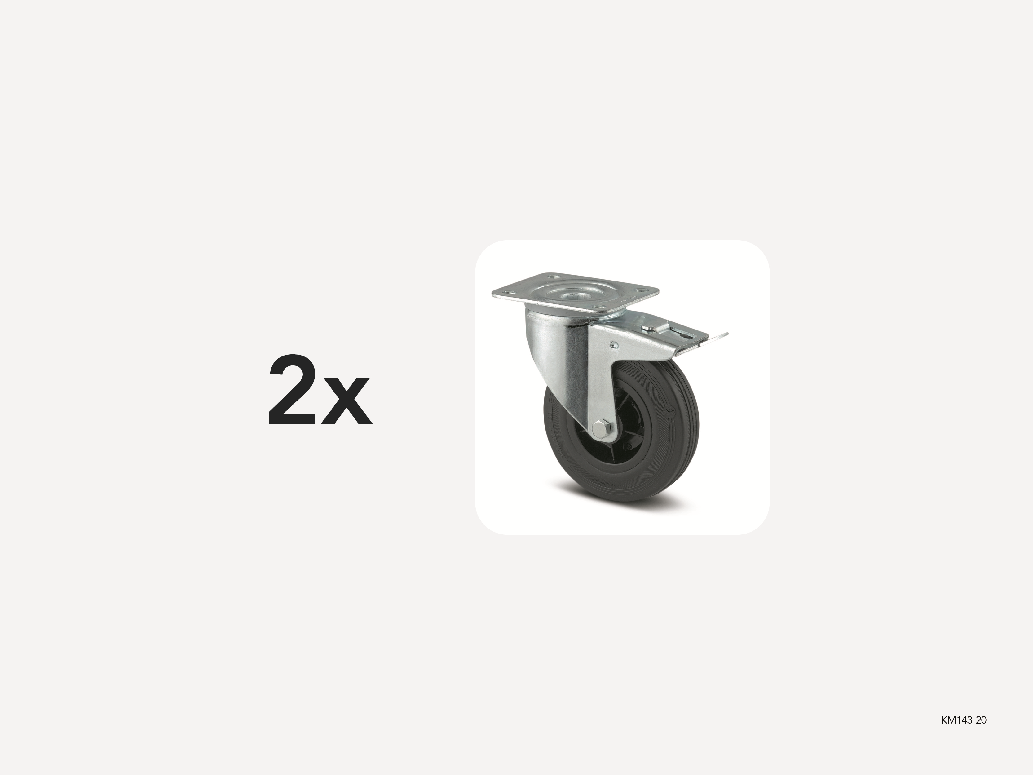 Länkhjul med totalbroms, gaffel tillverkad av pressatstål, zinkkromaterad, svängkrans med dubbeltkullager, hjulaxel med mutter, dammskydd, fästplatta.Hjul kropp gjord av polypropylen,Bana: massiv gummi, svart, rullager