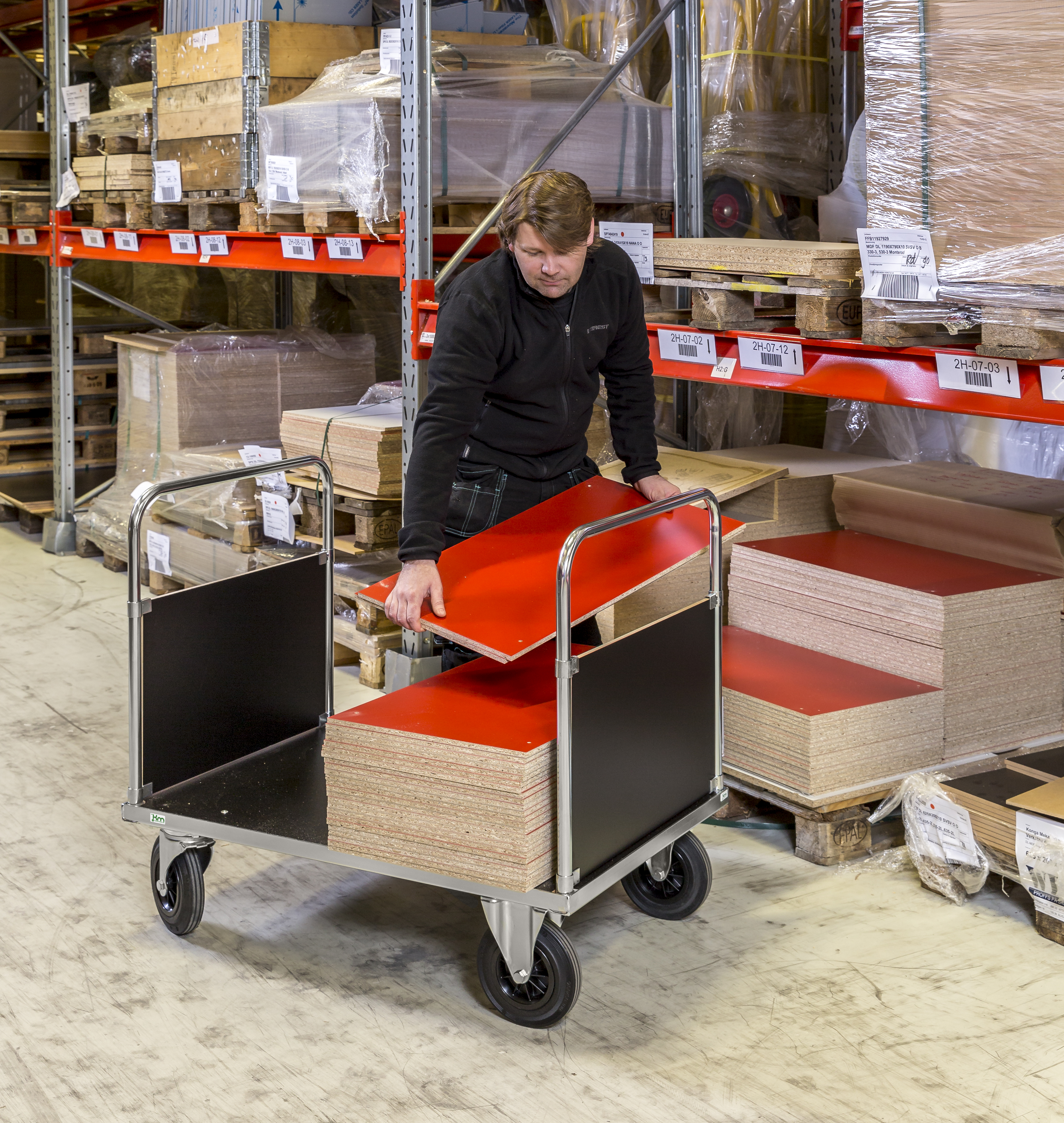Elförzinkad med laminatskivorHöjd till lastplan 260 mmGavelskiva i laminat, höjd 400 mmByglar 25 mm stålrör2 fasta, 2 länk massiva gummihjul 200 x 50 mmBelastning: 500 kg