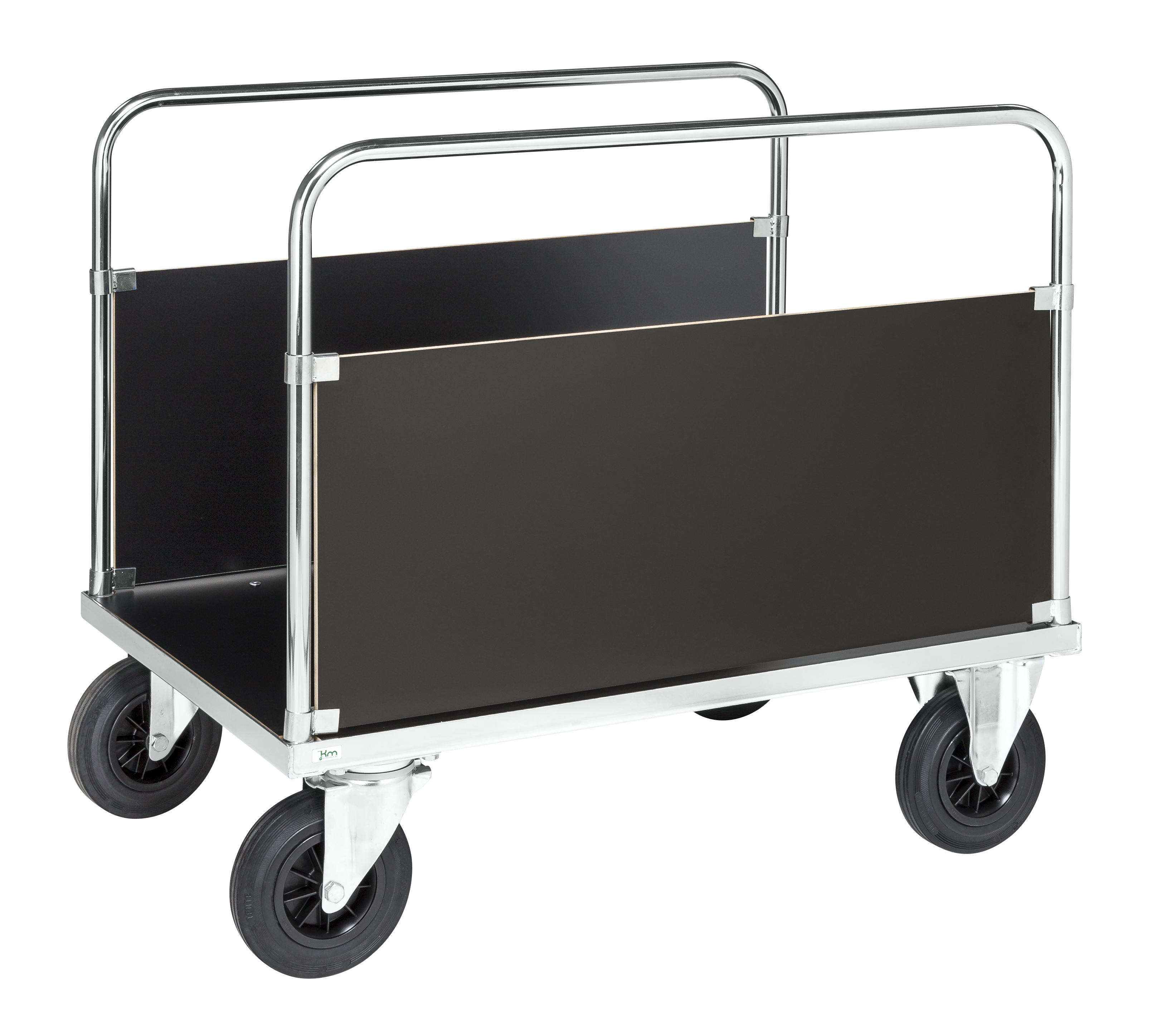 Elförzinkad med laminatskivorHöjd till lastplan 260 mmGavelskiva i laminat, höjd 400 mmByglar 25 mm stålrör2 fasta, 2 länk massiva gummihjul 200 x 50 mmBelastning: 500 kg