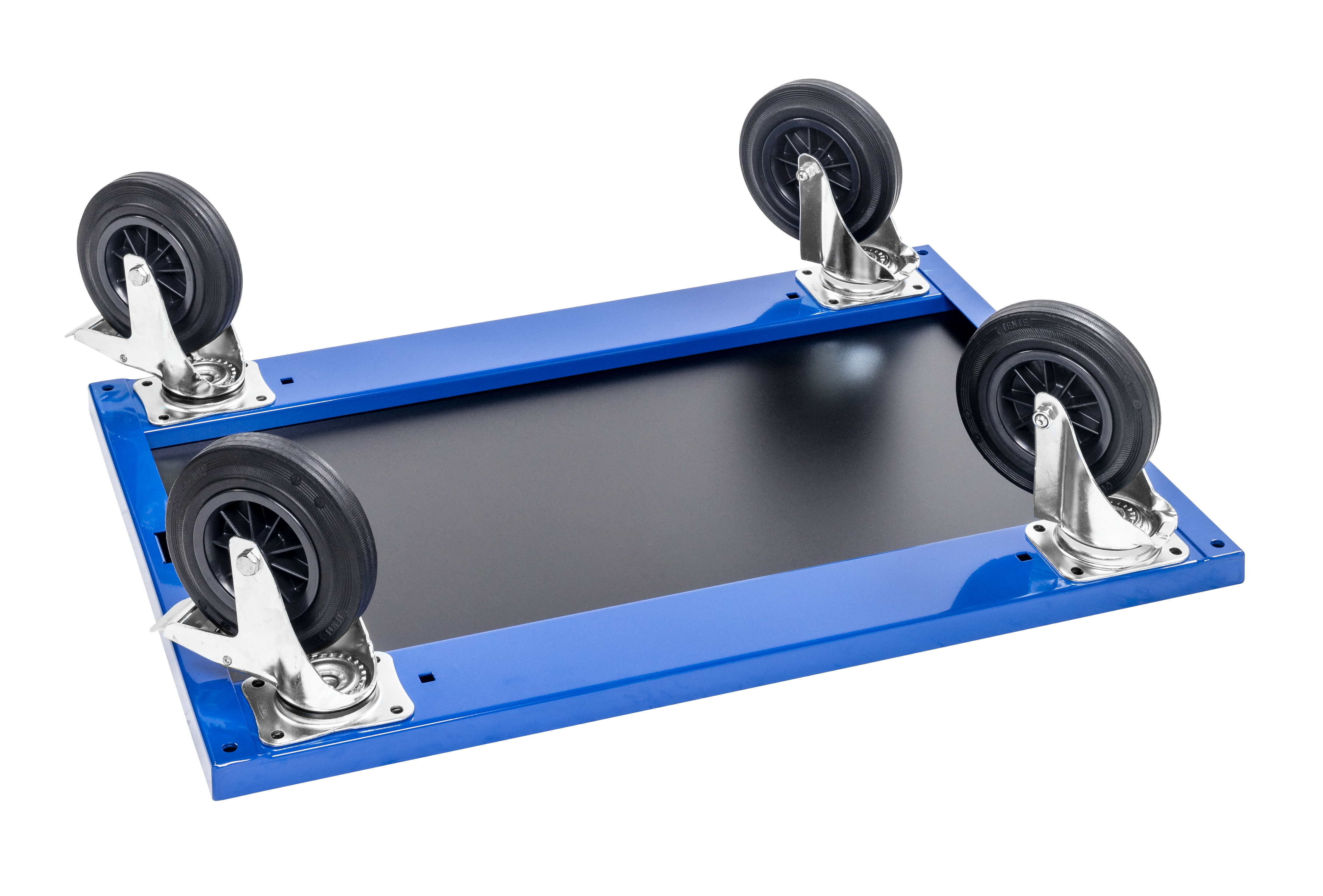 Länkhjul med totalbroms, gaffel tillverkad av pressatstål, zinkkromaterad, svängkrans med dubbeltkullager, hjulaxel med mutter, dammskydd, fästplatta.Hjulkropp gjord av polypropylen,Bana: massiv gummi, svart, rullager